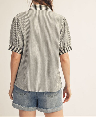 Striped pattern top with gingham check contrast detail.