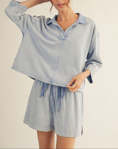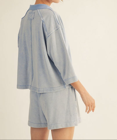 3/4 sleeves ,raw cut edge detail, reverse stitch, drawstring waist shorts, side pockets.