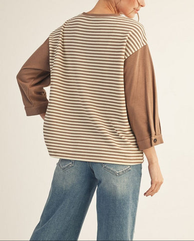 3/4 sleeves stripe pattern, drop shoulder, solid contrast sleeve and neck binding, pleat sleeve detail.