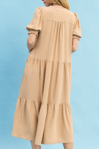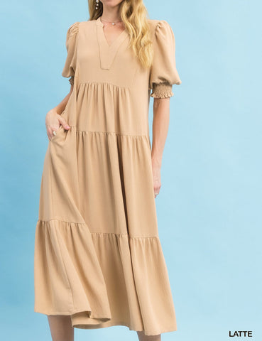 • V-Neck• 3/4 Puff Sleeves• Tiered Midi Dress